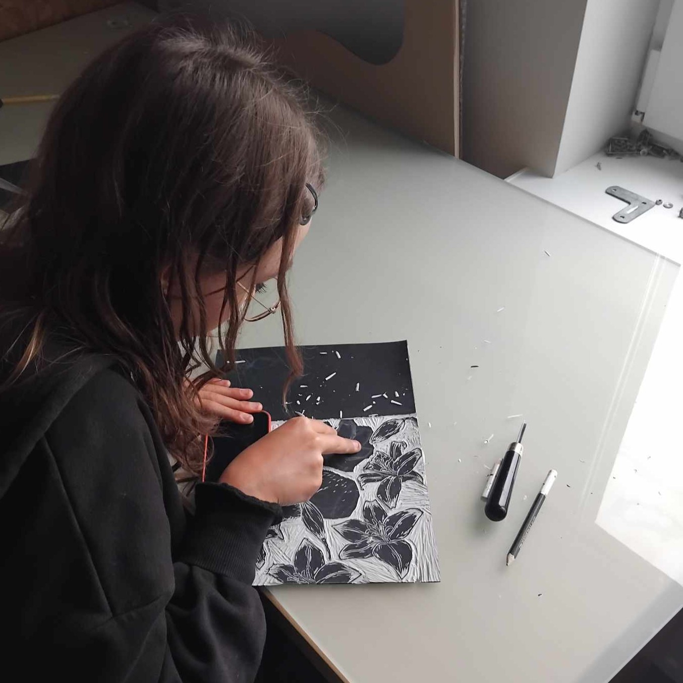 Zajęcia z grafiki warsztatowej dla młodzieży uczą myślenia obrazem i pracy nad projektem od pomysłu do gotowej formy. Uczestnicy rozwijają wyobraźnię, kompetencje twórcze i umiejętność świadomego działania, ucząc się, jak przekładać ideę na materialną pracę artystyczną.